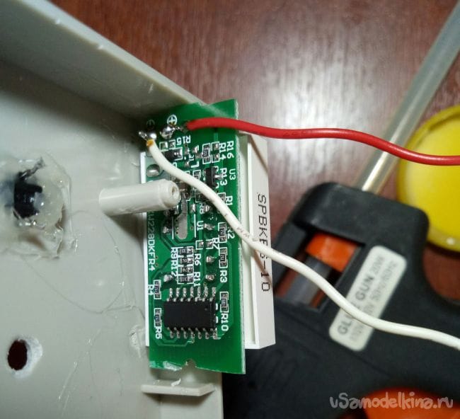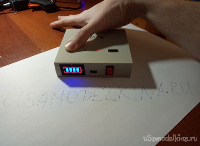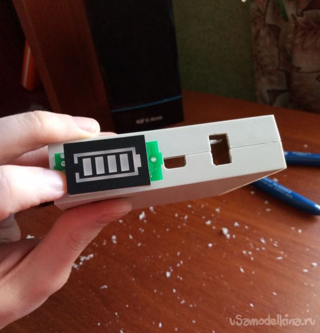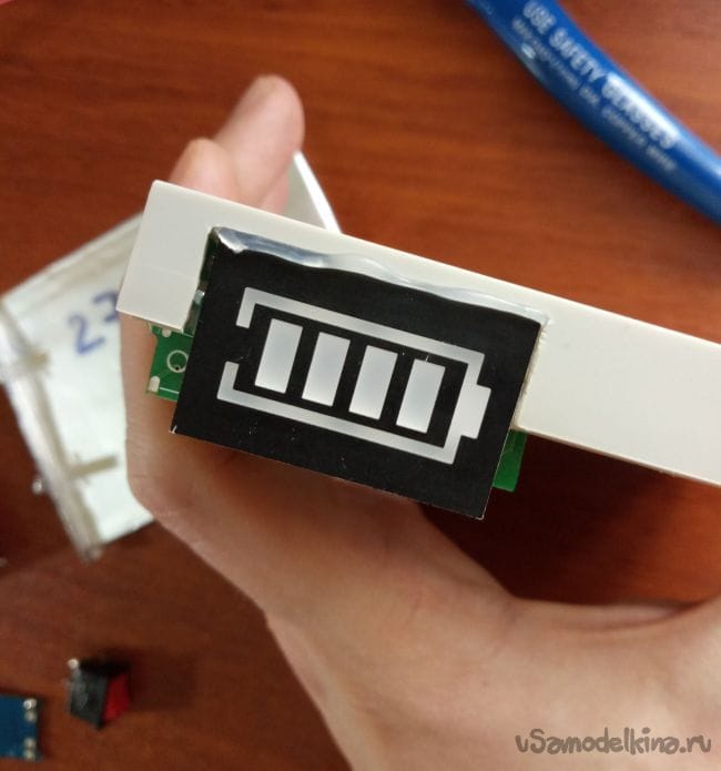 Все тем же горячим клеем, но уже на боковую панель, фиксируется модуль индикатора оставшегося количества заряда.