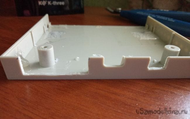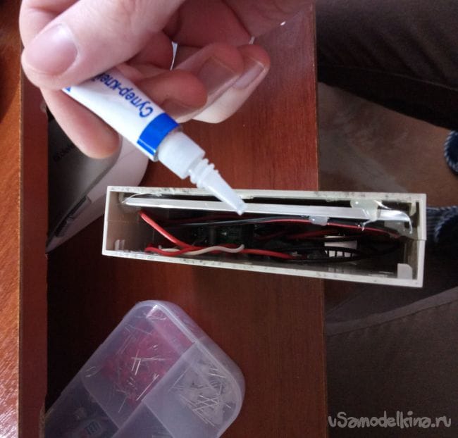 На открытую стенку коробки по периметру нанес быстросохнущий супер клей. Вырезал из тонкого пластика подходящий кусок и приклеил.
