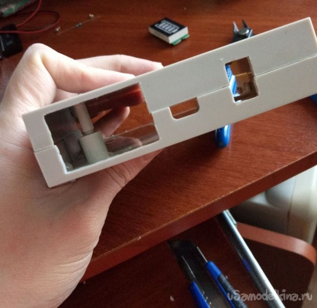 Далее я наметил расположение плат (заряда/разряда, dc-dc повышающего преобразователя) и usb порта. Сначала вырезал отверстие для usb разъема. Хотя на плате dc-dc преобразователя имеется свой usb порт, но припаян он как-то криво и по длине плата не умещалась если в корпусе ее разместить вверх разъемом. Поэтому я использовал отдельный usb разъем.