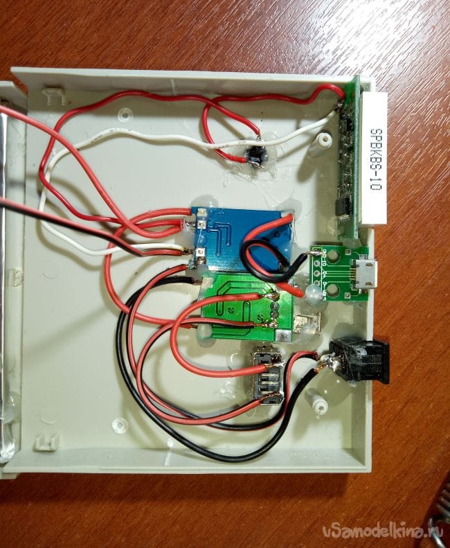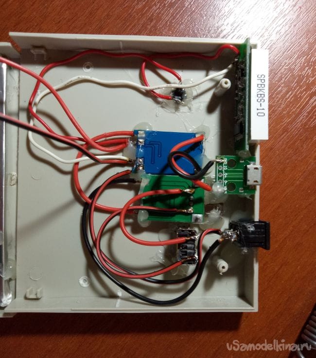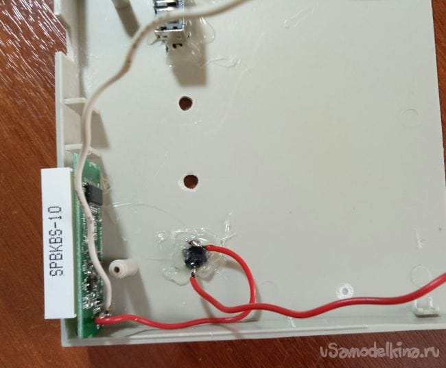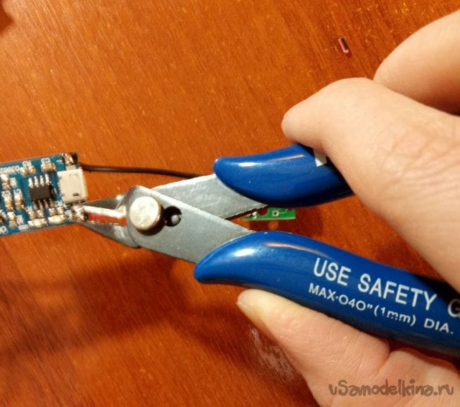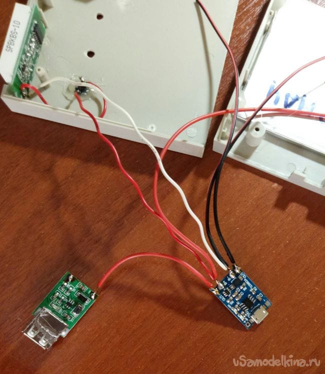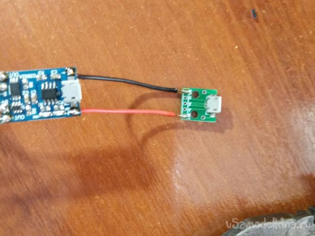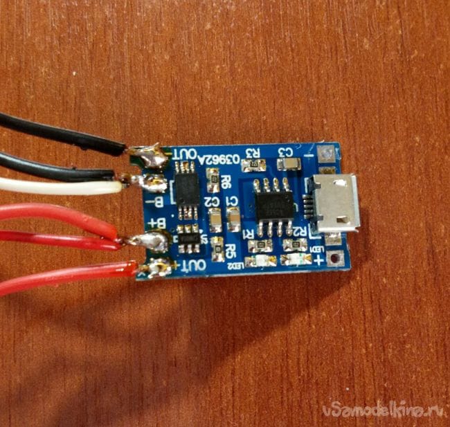 Также припаял 2 провода, соединив micro usb вход и схему контроллера зарядки.
