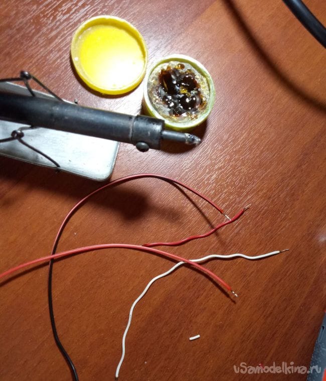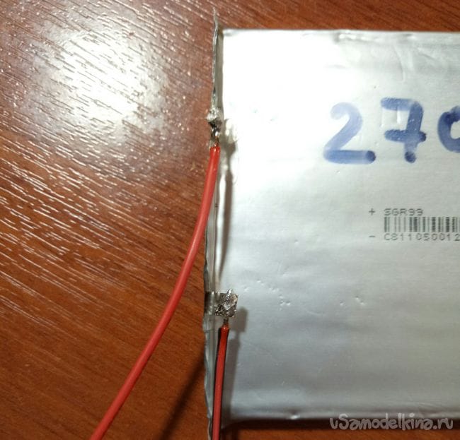 Вначале припаял провода к контактам аккумуляторной батареи.