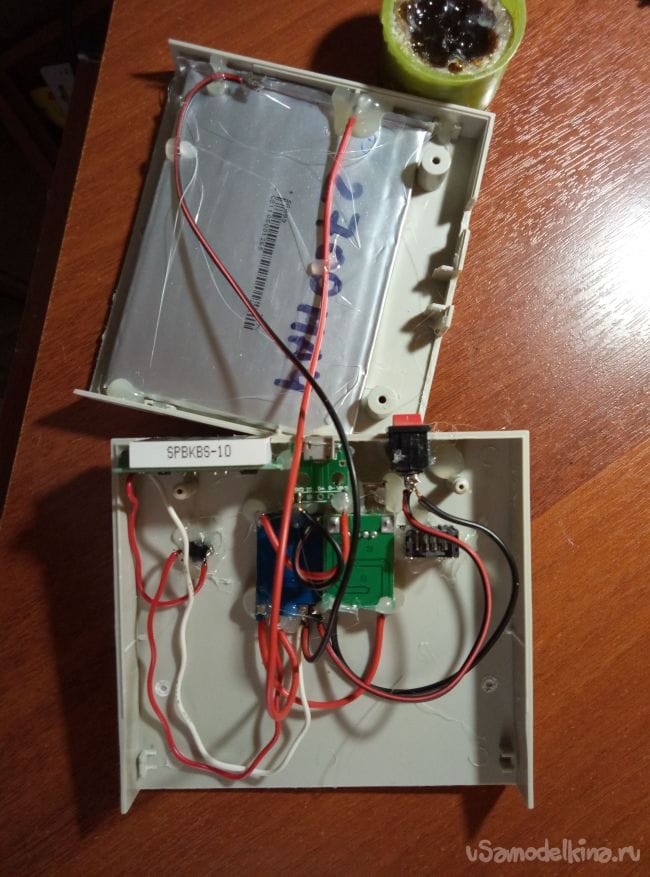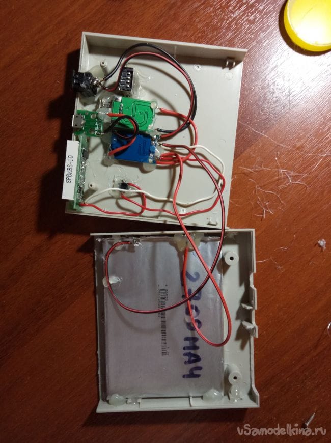 Причем аккумулятор довольно тонкий и я закрепил его на одной стороне коробки.