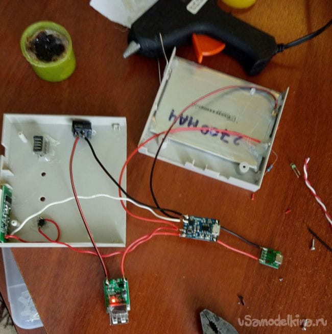 Затем поставил usb порт в заранее подготовленное отверстие и зафиксировал горячим клеем. Таким же образом установил и зафиксировал клеевым пистолетом кнопку, которая будет включать индикацию уровня оставшегося заряда повербанка.