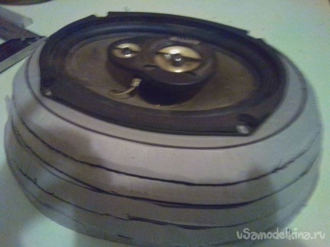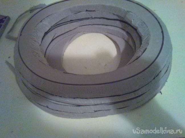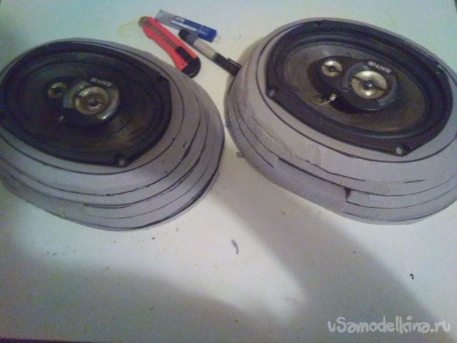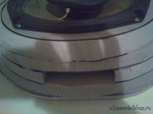 Берём динамик и пенопласт, размечаем посадочное место и отступаем от его краёв 20 мм, далее от этой разметки ещё 20 мм, делаем разметочные полосы. Вырезаем овал по крайней отметке, затем посадочное место( стараемся вырезать по рельефу динамика, для более плотного прилегания).