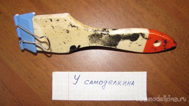 Далее подбираем обыкновенный канцелярский зажим той ширины, какой ширины кисть вам нужна, и подгоняем ширину ручки к ширине зажима. Ручку лучше не обрезать ножом, а отпилить, так будет аккуратнее, и нет риска, что дерево отколется не там где нужно.