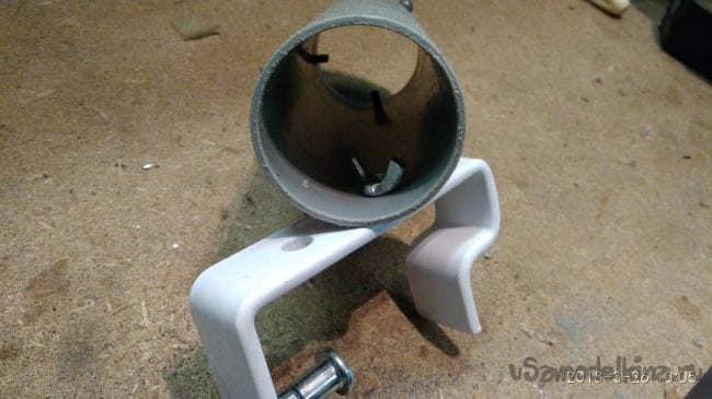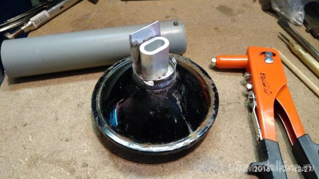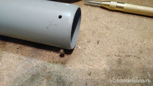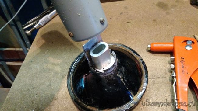 В трубе просверливаю три отверстия под винты м5 для крепления фары путём поворота её в левую сторону