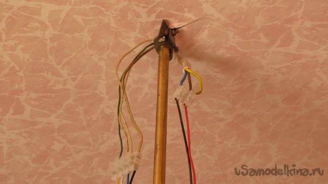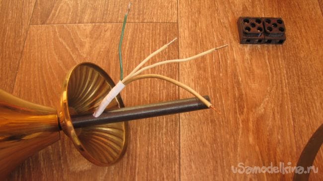 Добавляем четвёртый провод, не забывая об их изоляции, особенно в местах, где происходит изгиб пучка проводов в отверстиях входа в трубки люстры.