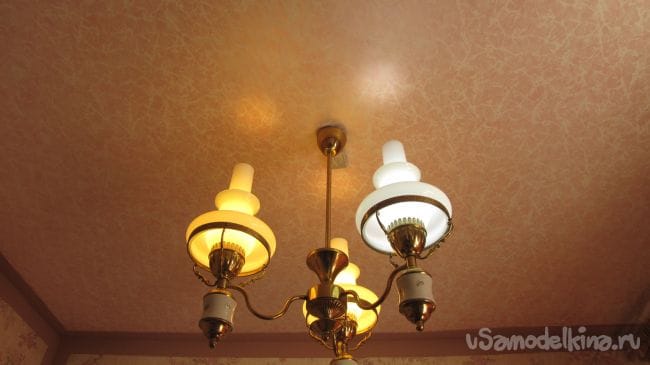 Подвешиваем люстру к потолку и подключаем к сети. Не забудьте обесточить проводку, выключив автоматы в щитке питания квартиры, и обязательно проверьте наличие напряжения на проводах, куда будете подключать люстру, контрольной лампой. В качестве контрольной лампы можно использовать, например, настольную или любую другую.