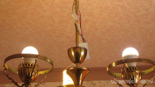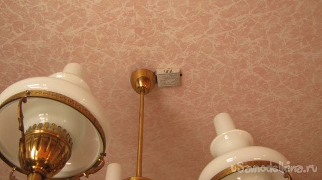 Релейный блок пришлось закрепить к потолку, внутри люстры он не поместился. Но нужно постараться, чтобы он был менее заметен. Если его заклеить такими же обоями, то практически не будет видно, где он находится.