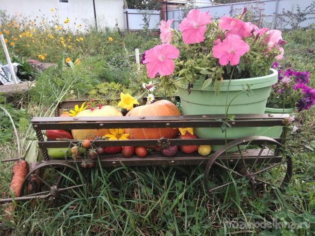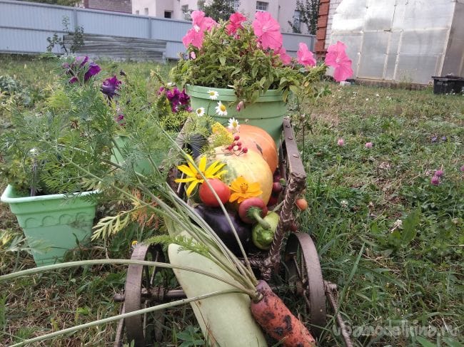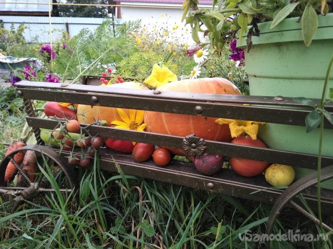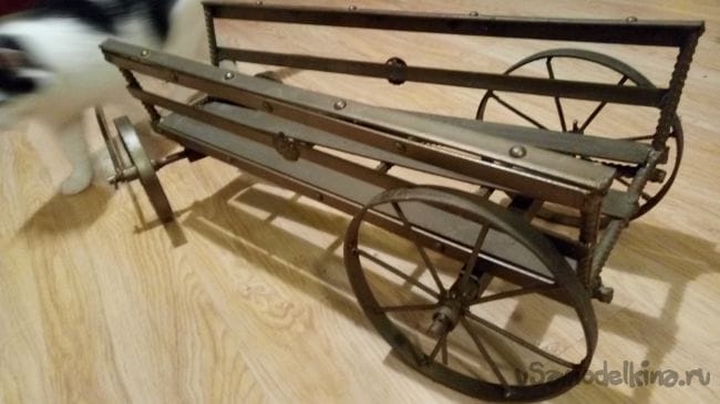Делюсь очередной самоделкой. Это садовая тележка для украшения участка сделана в 2017 году. Как и с теплицей - геодезическим куполом, были муки творчества из чего и как ее сделать: метал или дерево, но опять победил металл, счел его обработку более технологичным и менее трудозатратным. Для изготовления использовал остатки труб и полос от теплиц, арматуру, прутки и пару баллонов с краской. Инструменты: болгарка, сварочный аппарат с причиндалами, дрель. Все делал на глаз, описывать особо нечего, все видно на фотографиях. Добавлю только, что колеса крутятся, но кошаки (3 шт) если запрячь, думаю, все равно сдвинуть не смогут)))