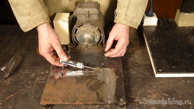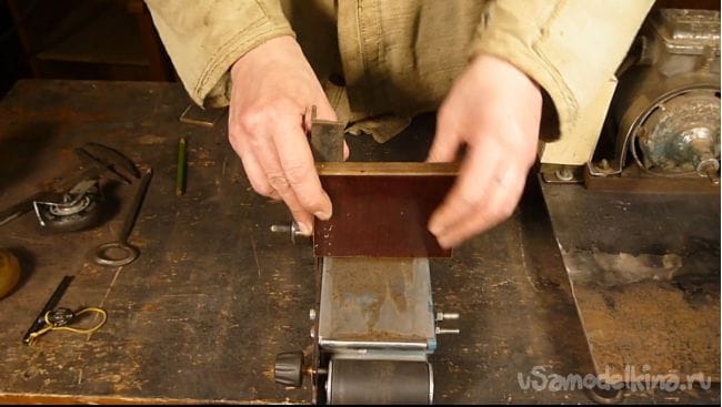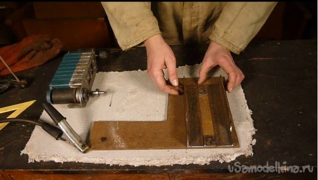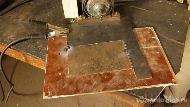 Станиной будет служить лист металла толщиной 5 мм. Для крепления, из металла 1 мм изготовили два хомута.