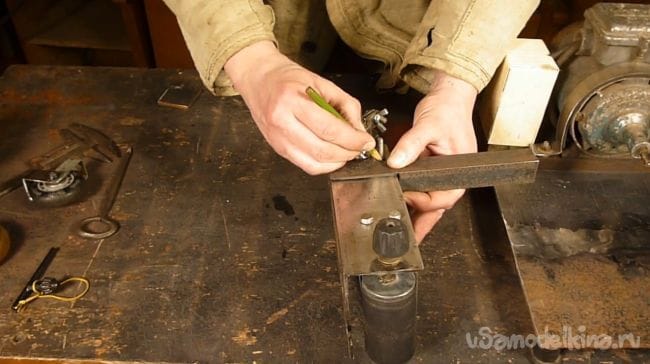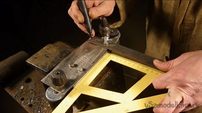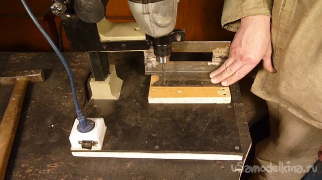 Размечаем местоположение ролика и сверлим отверстие в станине.