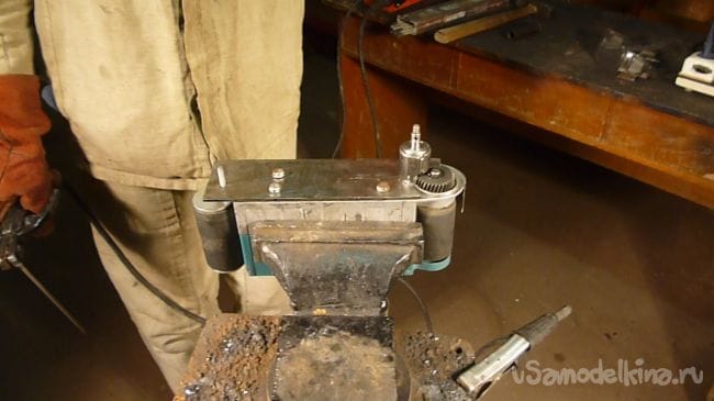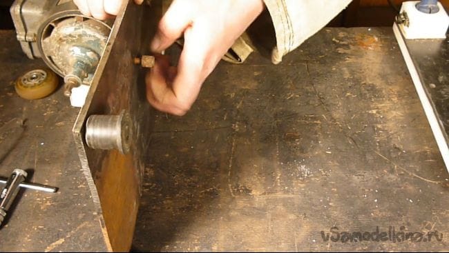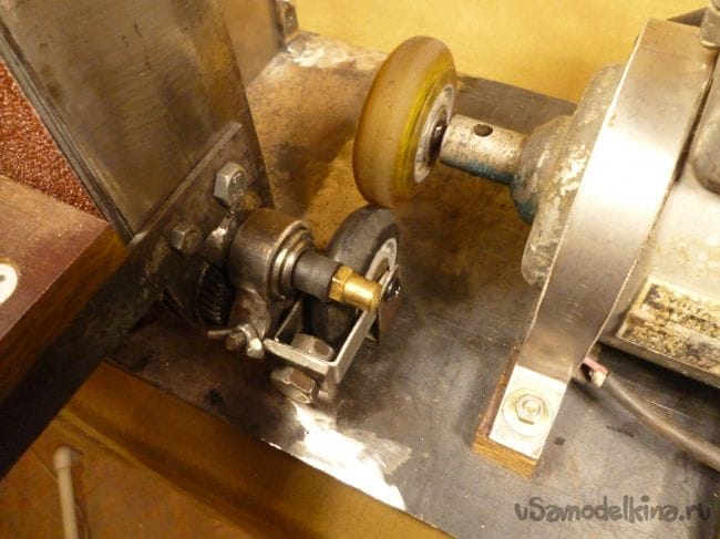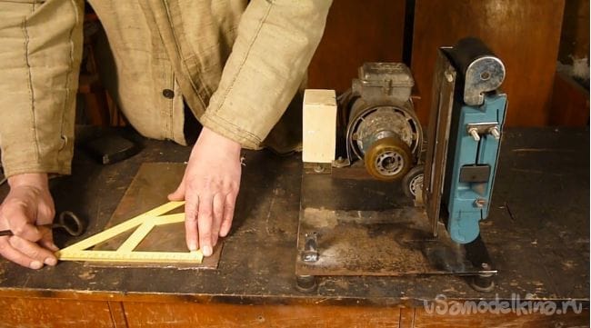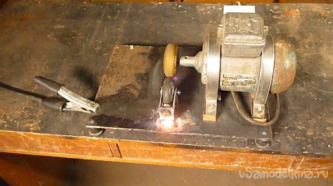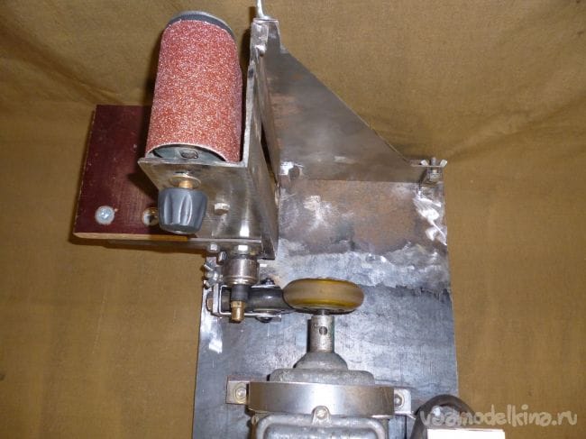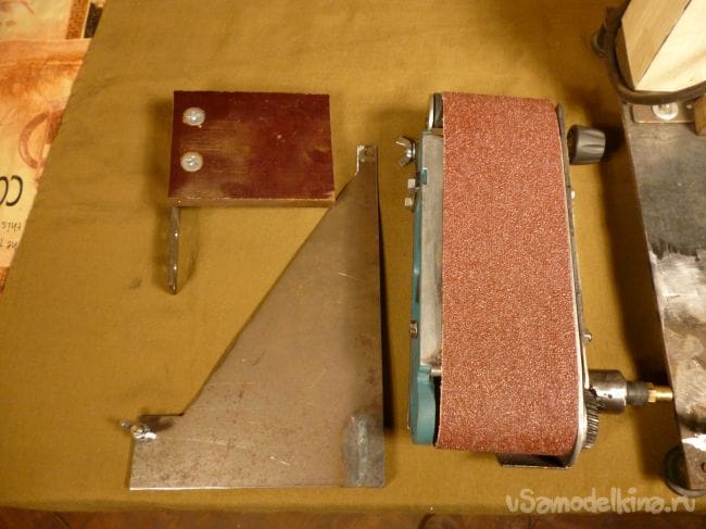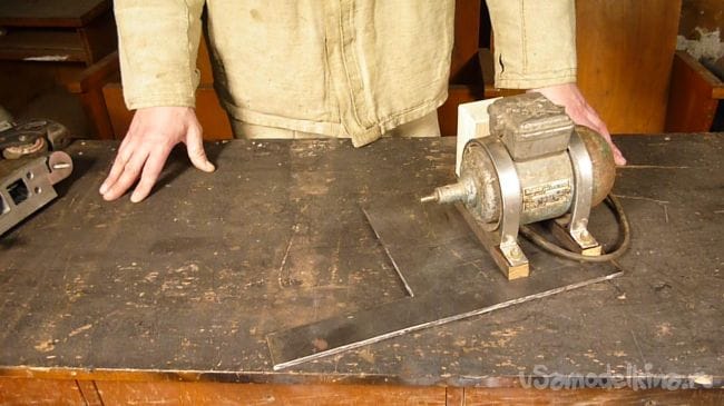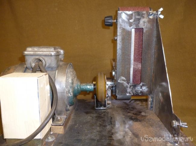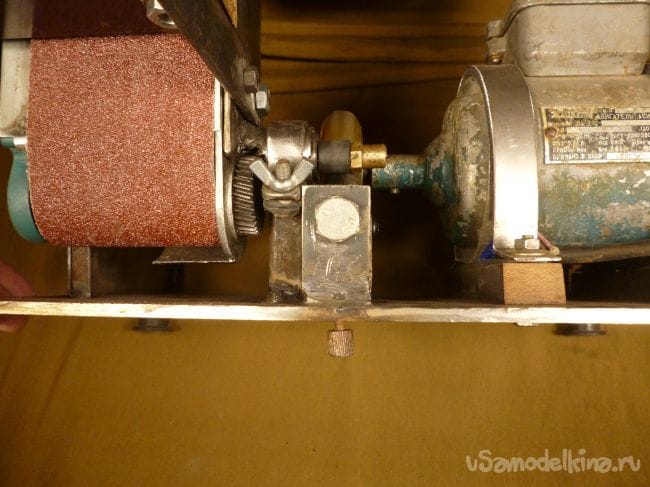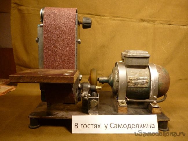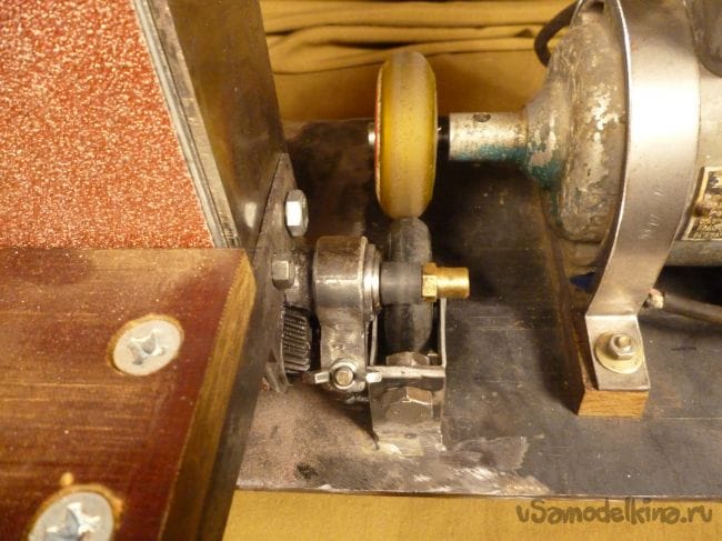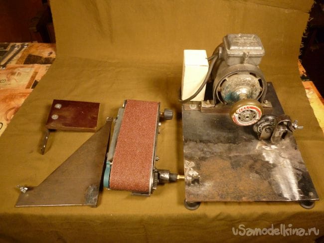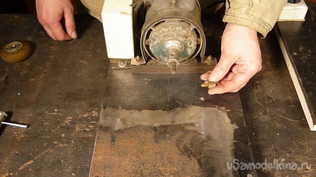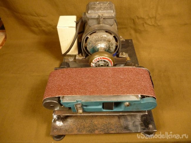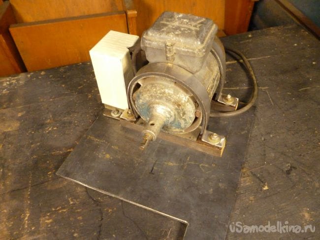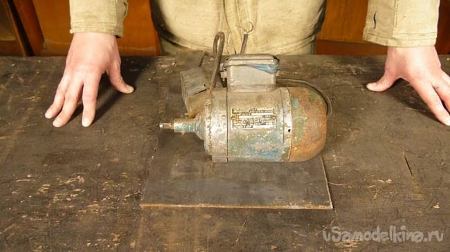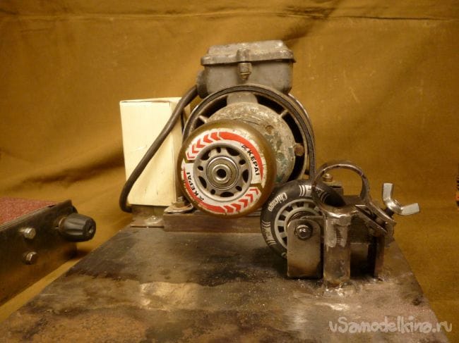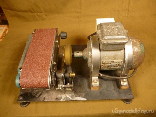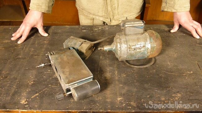 Порывшись в закромах мастерской нашли старый, но рабочий электродвигатель советских времен и подошву от ленточной шлифмашины. Пришла мысль соединить их вместе.