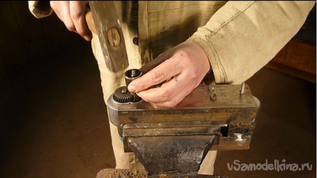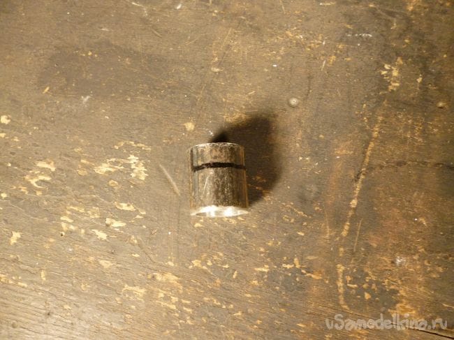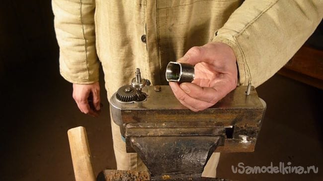 Из водопроводной трубы отрезаем 3 см. и делаем вырез под шестерню.