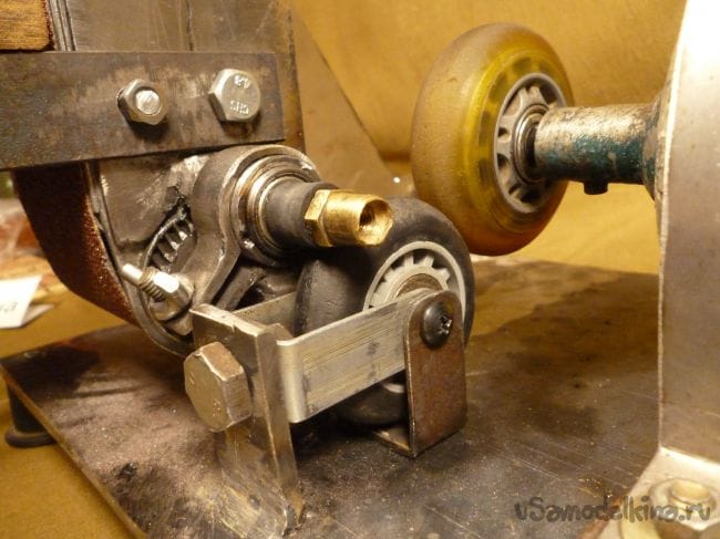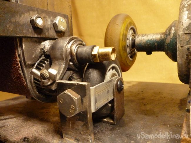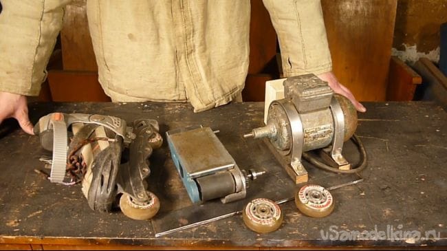 Теперь нужно присоединить подошву от шлифмашины к двигателю. К сожалению от шлифмашины не осталось ни ремня ни шестеренок. Покопавшись еще в мастерской нашли сломанные роликовые коньки. Будем комбинировать.