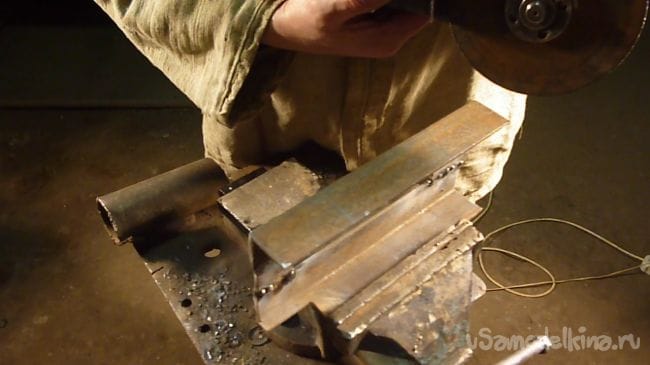 Делаем металлический кожух для крепления подошвы. Мы использовали уголок с полкой 50 мм. Сварили два отрезка через небольшие вставки из полосы.