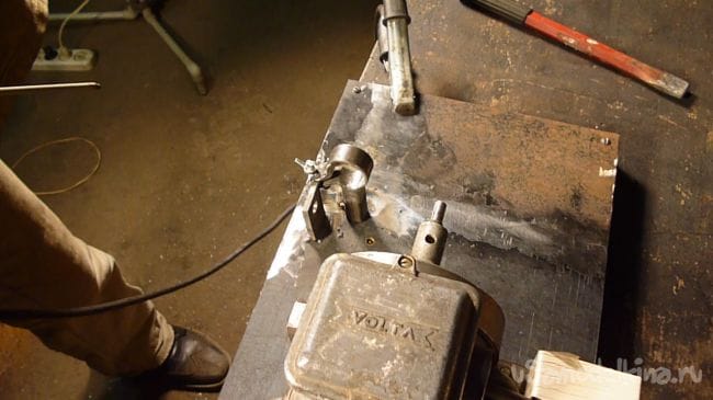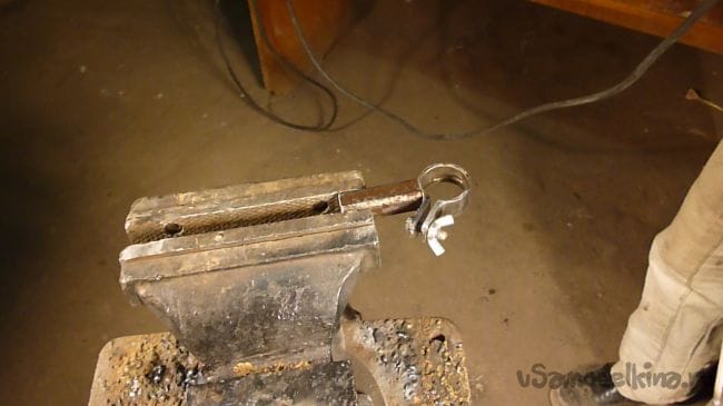 Для крепления всей этой конструкции к станине делаем хомут на стойке. К разрезанному отрезку водопроводной трубы диаметром 25 мм. привариваем ушки просверленные под болт.
