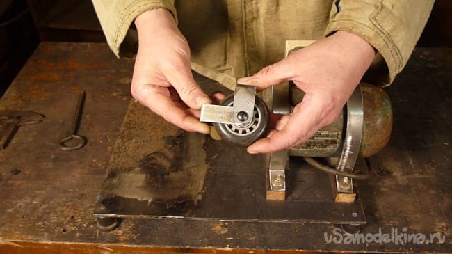 Пришло время коньков. Один ролик заклиниваем на валу двигателя, для другого делаем крепление в виде двух букв П, скрепленных между собой осью ролика. В одной из деталей сверлим отверстие под болт.