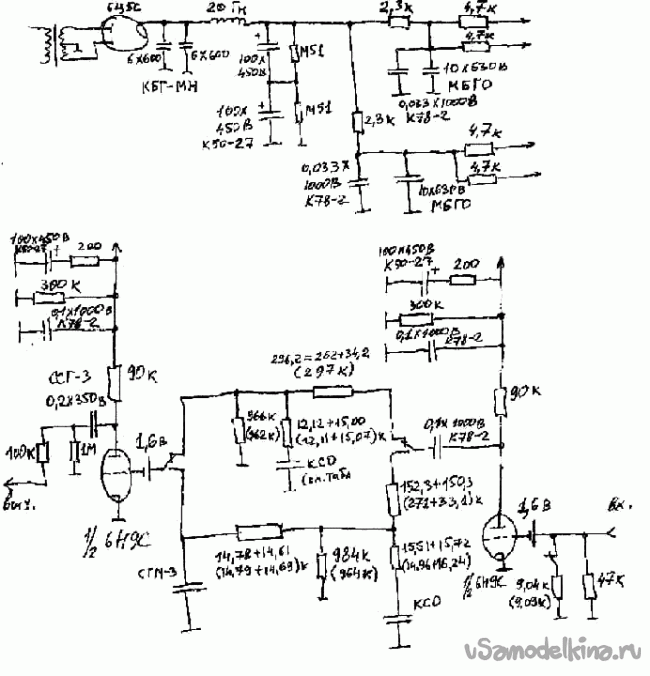 Существует также работа [2], где этот винилкорректор, при участии авторов пересчитан на лампы 6Н9 – похожие триоды, только по две штуки в одном стеклянном баллоне, (6Г2 в железном). Такое же высокое внутреннее сопротивление и большой коэффициент усиления, почему нет?