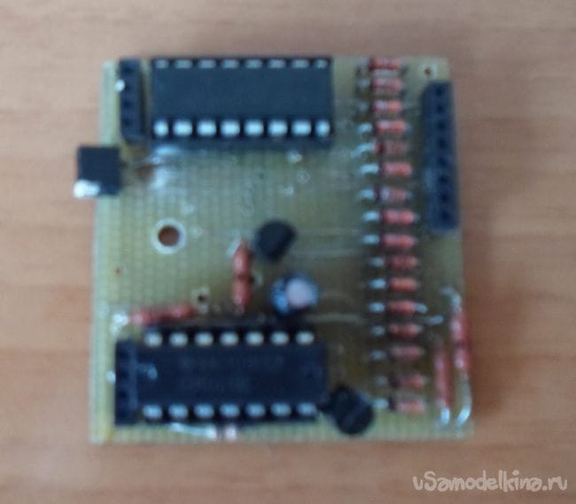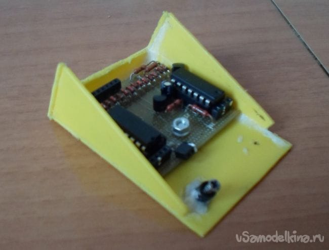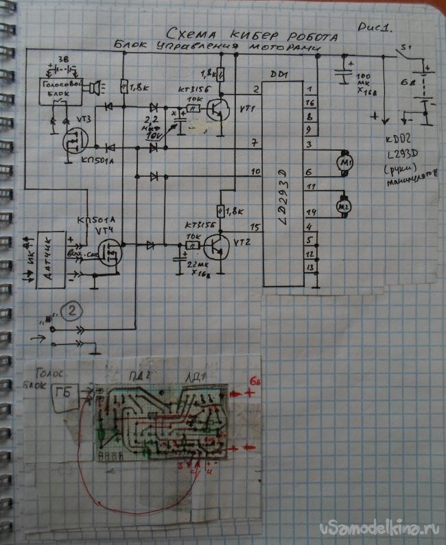 Блок управления моторами распознаёт сигналы с датчика и даёт соответствующие команды моторам. Таким образом, когда кибер робот подъезжает на определённое расстояние к препятствию, он отъезжает от него назад и делает небольшой поворот в сторону, затем далее следует вперед. Вот такой небольшой алгоритм работы электронного блока управления моторами. Основываясь на данный алгоритм, мной была разработана принципиальная электрическая схема Рис.1 Общий вид расположения датчика приближения и электронного блока управления моторами кибер робота показан на Фото 16. Фото 16.1