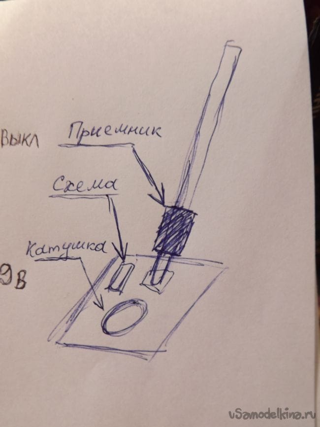 Шаг 3: сборка и настройка металлоискателя. На ровной поверхности,например фанере,располагаем катушку со схемой и питанием. На рукоятке в непосредственной близости к схеме крепим радиоприемник,это необходимо для хорошей связи с генератором колебательного контура. вот примерная схема: