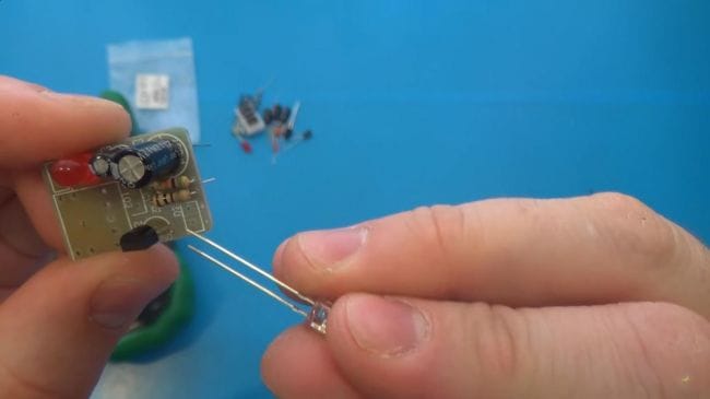 После резисторов устанавливаем на плату конденсаторы, их на передающей плате всего два, а их емкость и напряжение подписаны. Также следует соблюдать полярность при установке, длинная ножка это плюсовой вывод, а короткая-минус, на плате штриховкой обозначен минус.