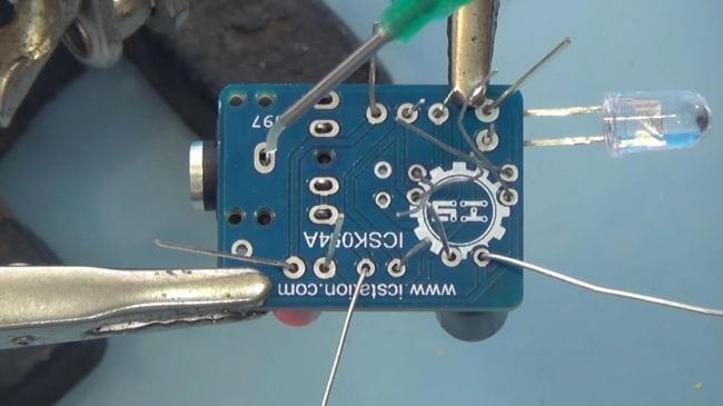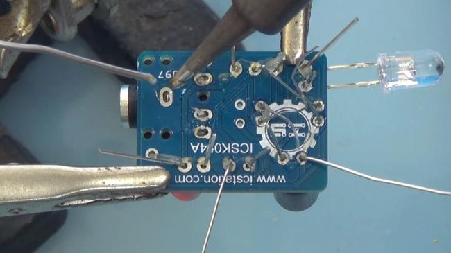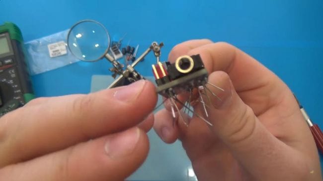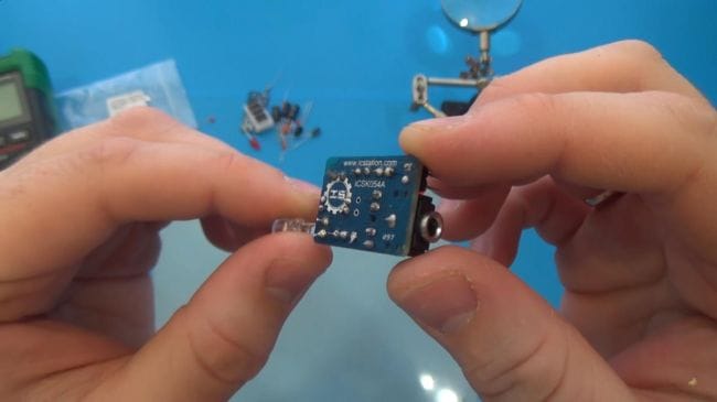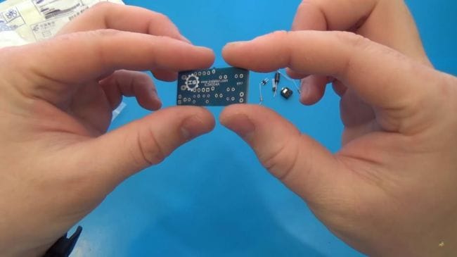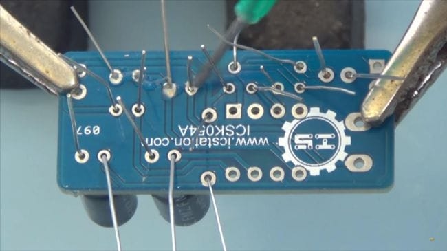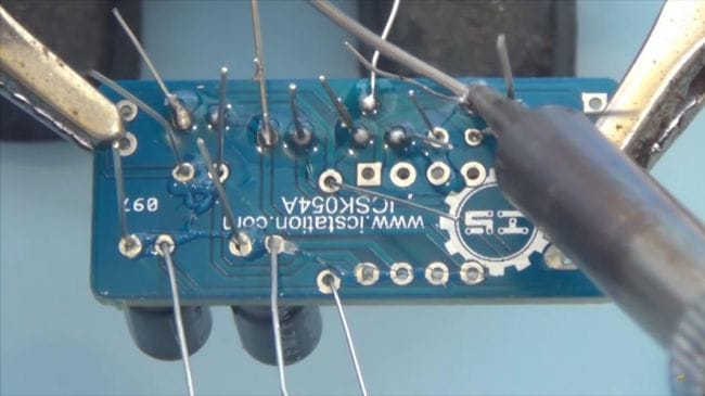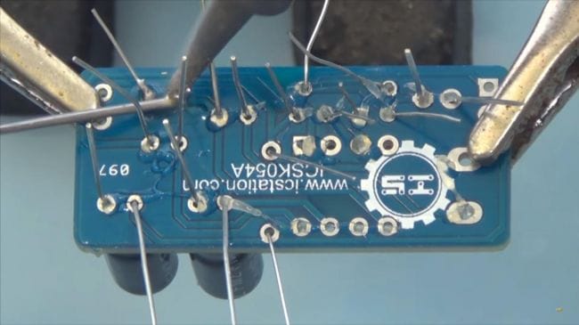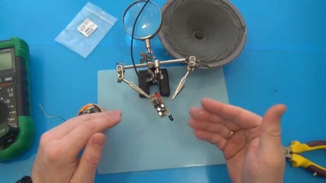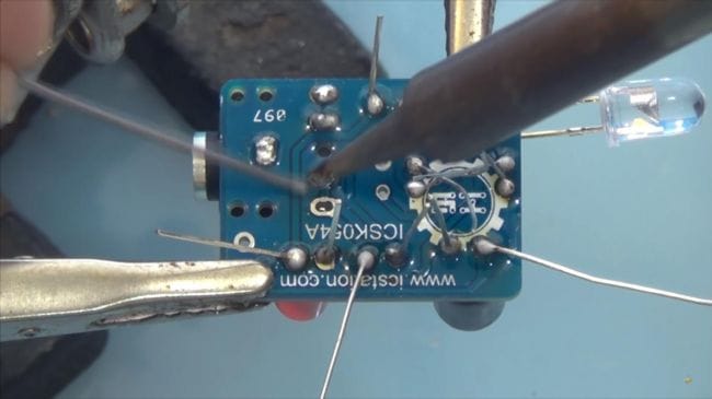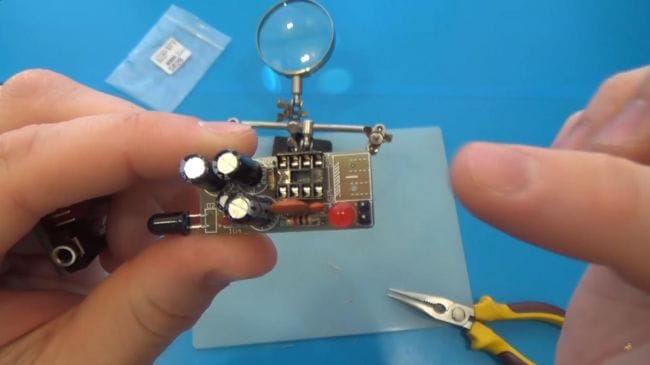 Закрепляем плату в приспособление для пайки "третья рука" и легким движением паяльника залуживаем контакты и припаиваем каждый вывод компонента, не забываем перед пайкой нанести немного флюса, что существенно улучшит процесс пайки.