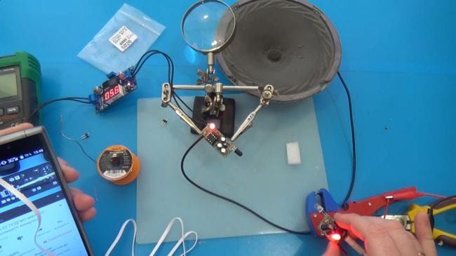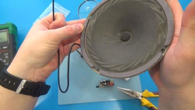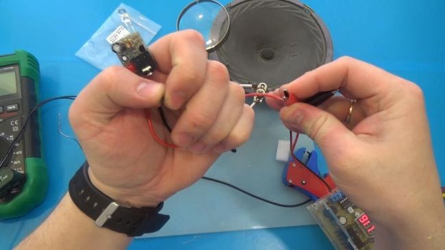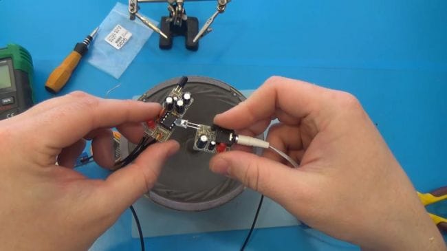 К передающей плате подключаем телефон при помощи кабеля AUX, а к принимающей подключаем динамик. При прямом наведении плат односительно друг друга звук слышно отчетливо и без искажений.