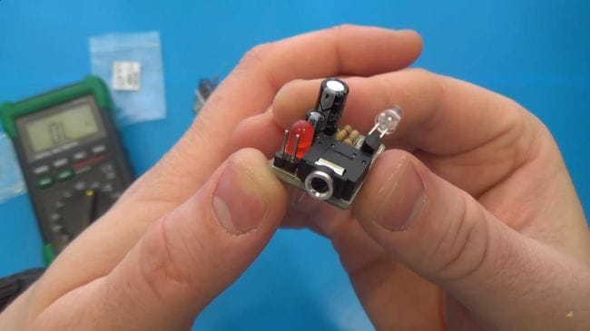 Далее располагаем на плате керамический конденсатор, согласно маркировке на его корпусе и надписи, указанной на плате, после чего остается поставить гнездо подключения 3.5мм для передачи звука при помощи кабеля AUX, а также установить парочку контактов, которые будут соединяться с блоком питания.