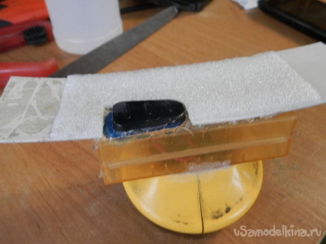 Изготавливаем крепление. Из ПВХ кромки вырезаем крепление с двумя проушинами. Наклеиваем поролон или другой мягкий материал небольшой толщины.