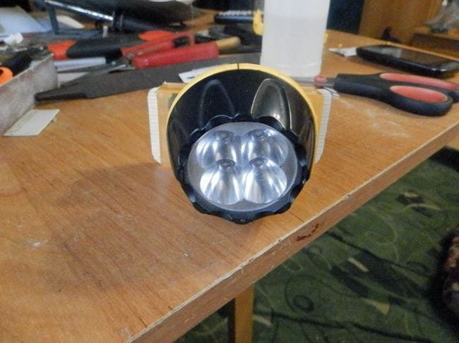 Изготавливаем корпус. вырезаем в боксе прорезь под выключатель. Затем отрезаем у фонарика переднюю часть.