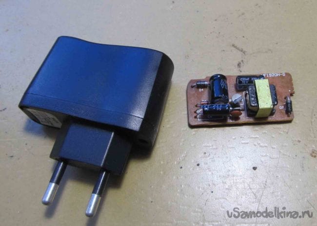 У многих дома валяются старые зарядки от телефонов. Нужна электронная зарядка. Осторожно вскрываем и достаем плату.