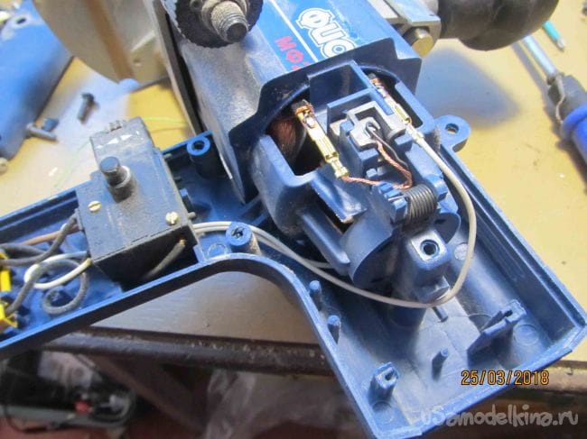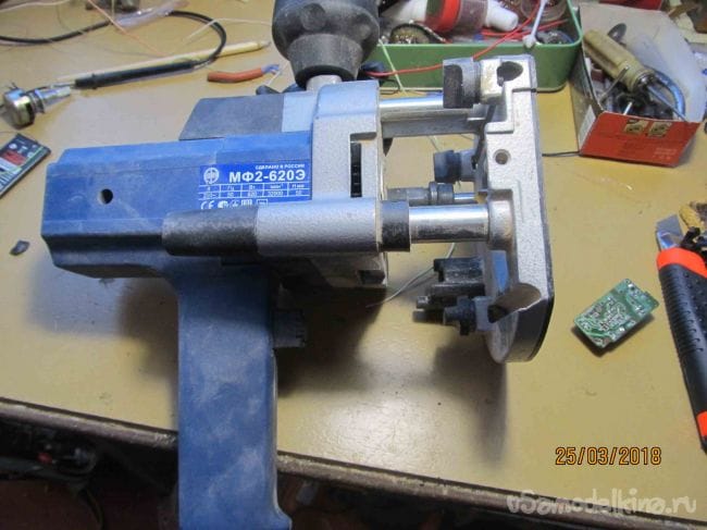 Запоминаем или зарисовываем куда было подключено 220 в и 5 в. и отпаиваем провода. Дальше разбираем машинку « Фиолент МФ 2-620Э»