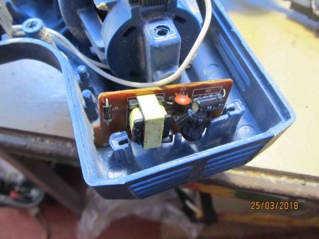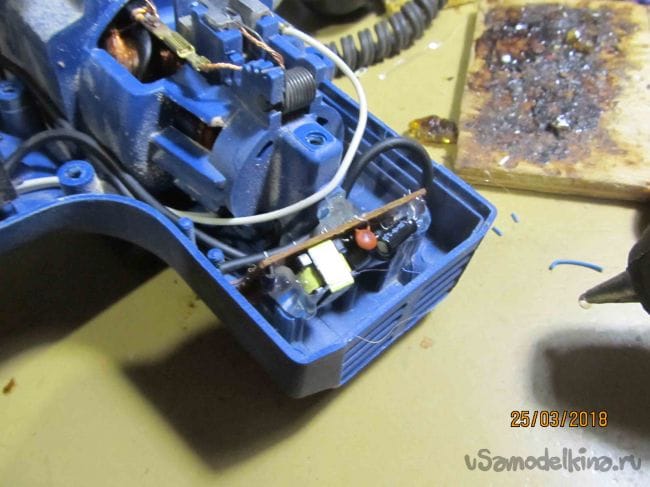 Теперь спаиваем всю схему. Резистор 6.2ома припаиваем к плюсу зарядки и закрепляем. Концы 220 в. с зарядки подключаем на сетевой провод фрезера. Они подключены на кнопку и зажаты винтами. Теперь можно проверить. Включаем в сеть и светодиоды должны загореться. Укладываем провода и плату зарядки, закрепляем с помощью термопистолета.