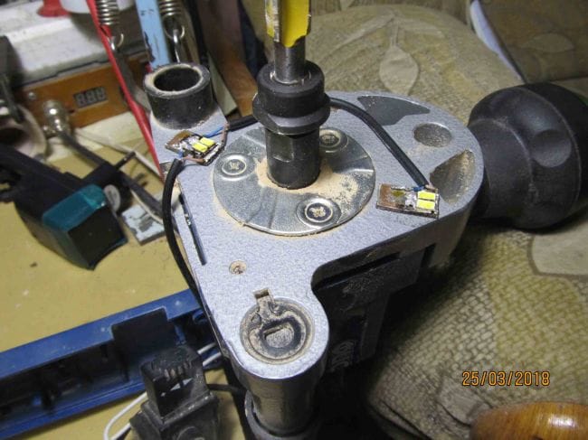 Фрезер « Фиолент МФ 2-620Э» хорошая, удобная, лёгкая и достаточно мощная машинка, но у неё есть существенный недостаток. Отсутствует подсветка рабочей зоны. Для подсветки потребуются следующие детали; зарядное устройство от телефона на 5 вольт, резистор номиналом 6.2 ома мощностью не менее 0.5 вт. , 4 светодиода и немного провода.
