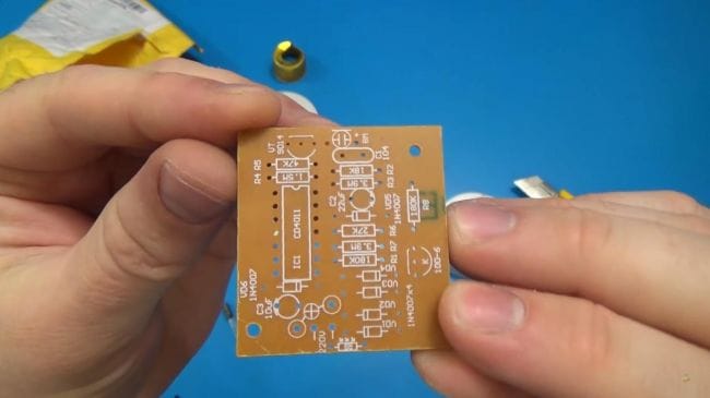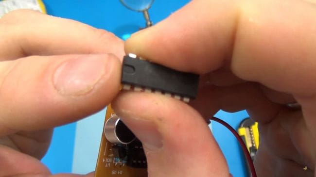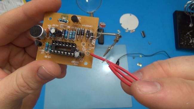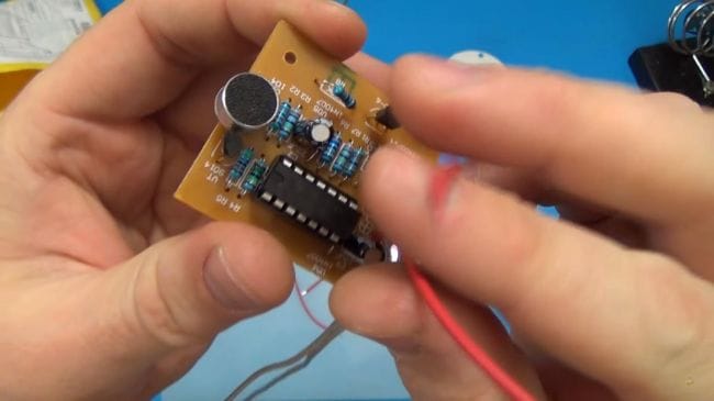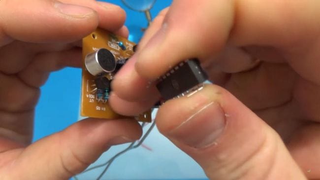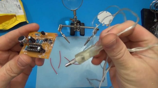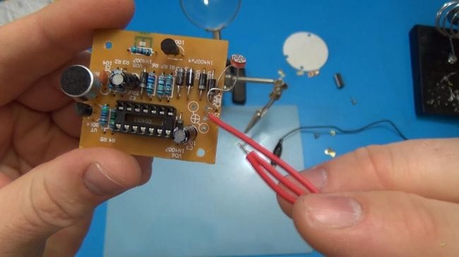 После этого припаиваем фоторезистор, микросхему и микрофон.
