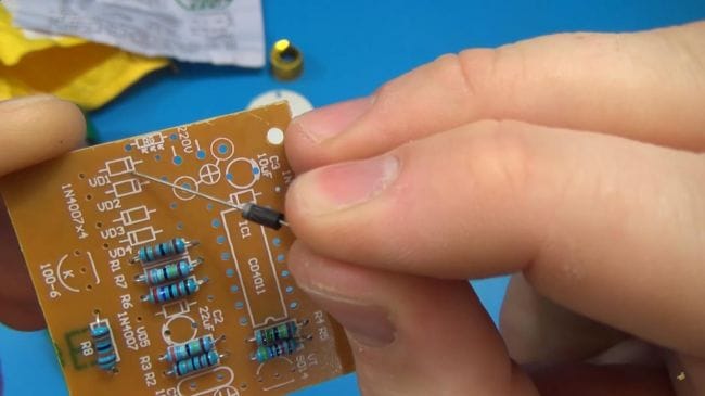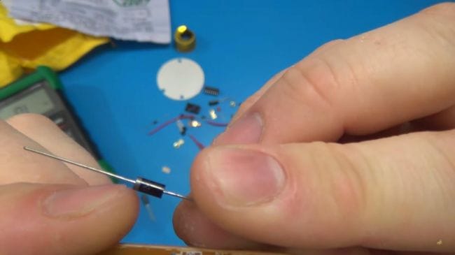 Теперь выставляем диоды, они все одинаковые, друг с другом не перепутаете. Устанавливаются полоской, расположенной на корпусе с полоской на плате, проделываем так со всеми диодами.