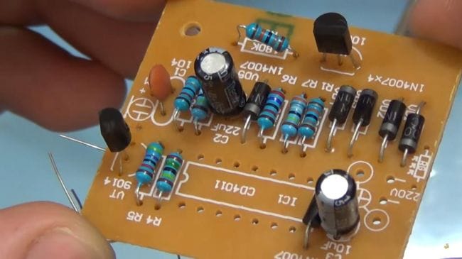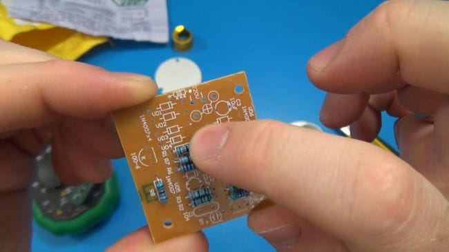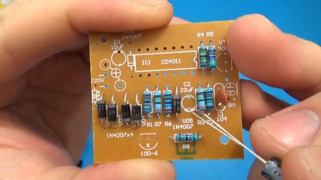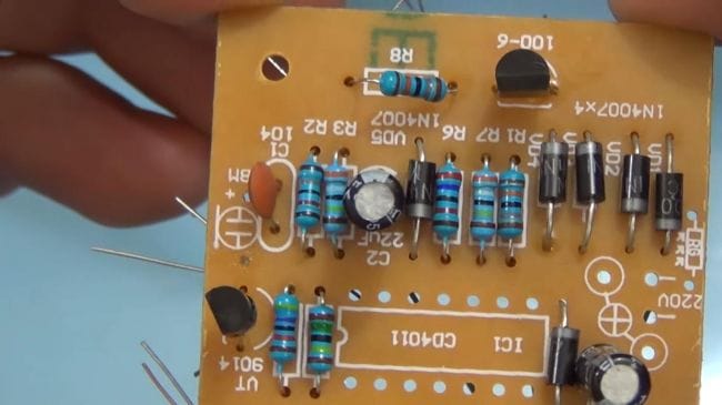 Маркировка на резисторах в виде цветных полосок позволяет определить их сопротивление, таблица для этих целей есть в интернете, ну а у кого есть мультиметр, можно измерить сопротивление при помощи него, это будет быстрее и удобнее. Рядом с резистором располагаем керамический конденсатор с маркировкой 103.