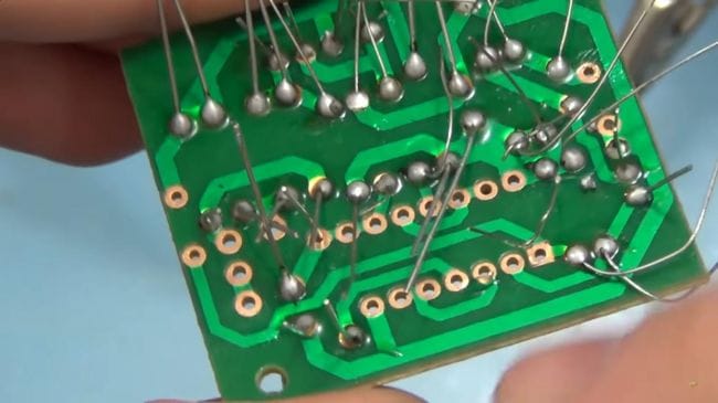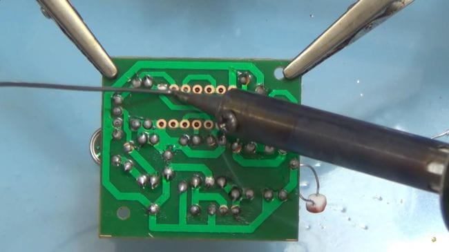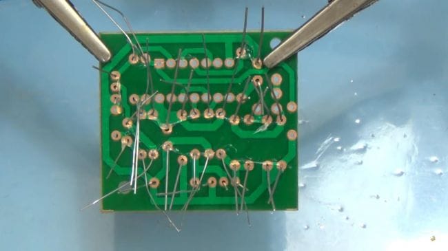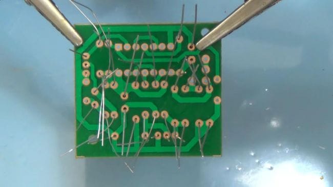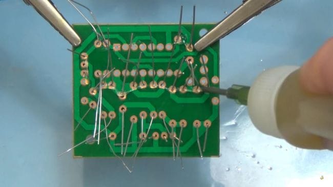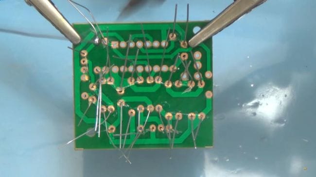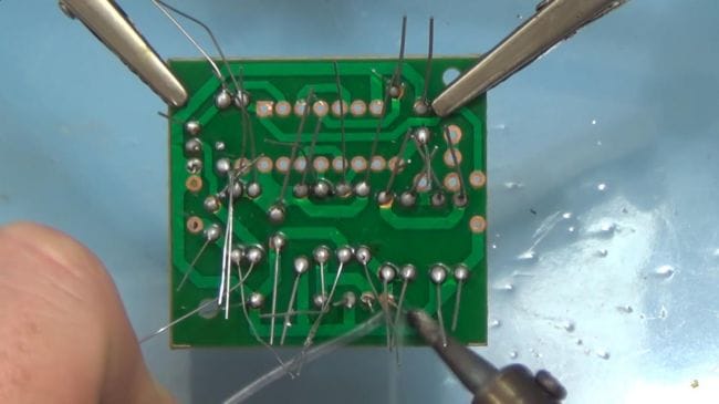 Вот на плате припаяна уже большая часть элементов, удаляем остатки выводов при помощи бокорезов, делаем это аккуратно, чтобы не повредить дорожки платы.