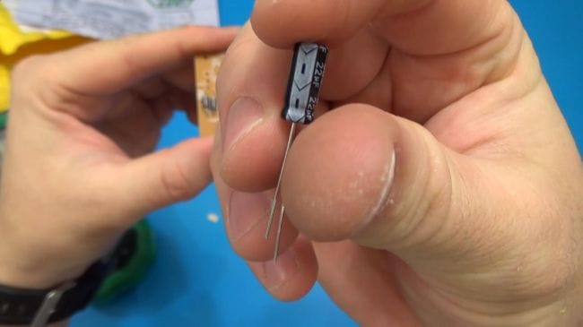 Затем переходим к конденсаторам, они имеют полярность и минус указан на корпусе серой полоской, ее совмещаем с заштрихованным белым полукругом, в данном случае просто жирной белой полосой, изображенной на плате. Также соблюдаем емкость, так как размеры у них одинаковы, но номиналы разные.