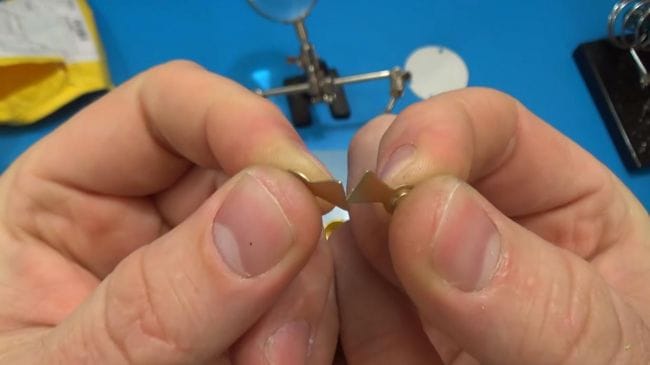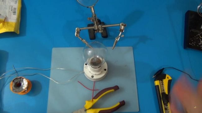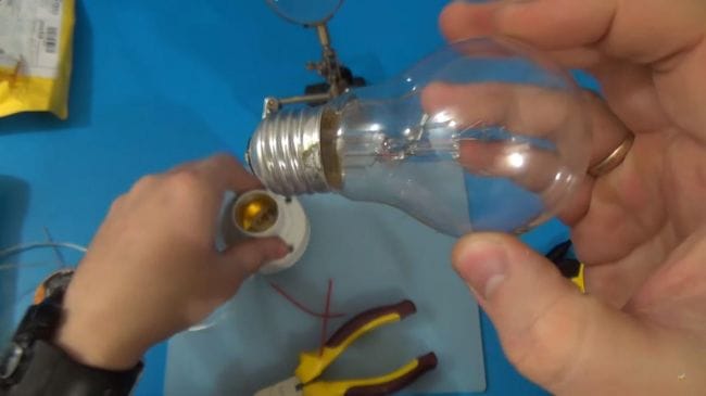 В цоколе устанавливаются две металлические шляпки, к которым припаиваем провода питания лампочки, затем их прикрутим к контактам.