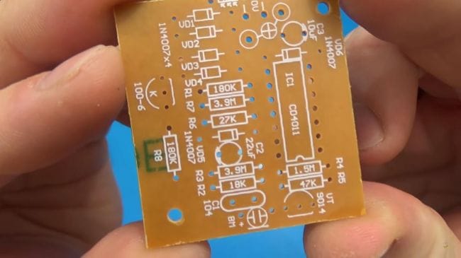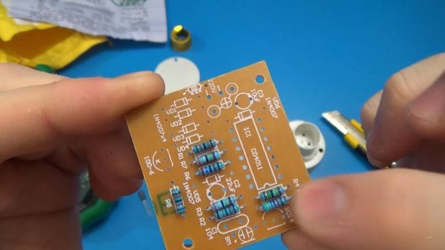 Измеряем номинал резисторов и расставляем на плате, ножки с обратной стороны можно слегка подогнуть, чтобы при пайке компоненты не выпали обратно. В итоге на плате должно быть 8 резисторов.