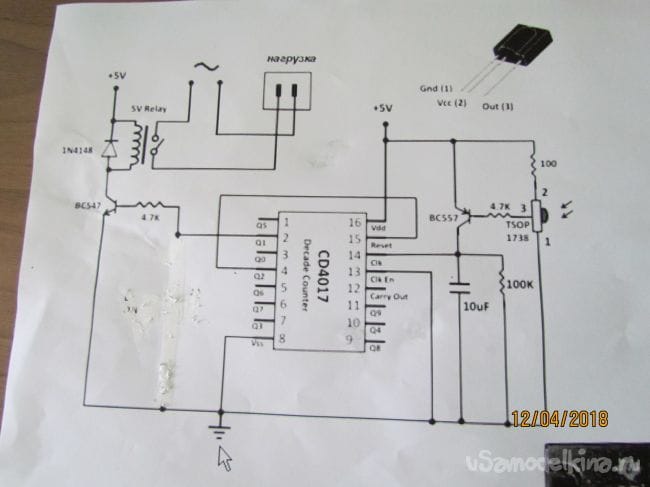 Включение приборов с помощью пульта дистанционного управления. Здесь посредником между фотоприемником и излучателем служит инфракрасный сигнал, который и управляет схемой включения определенной нагрузки. Это сегодня популярное устройство, очень удобное в применении, особенно для Ленивых. Одно из таких устройств я и предлагаю вашему вниманию. Ядром данной схемы является десятичный счетчик с дешифратором CD4017. Инфракрасный сигнал принимается фотоприемником TSOP1738, работающий на частоте 38кГц.