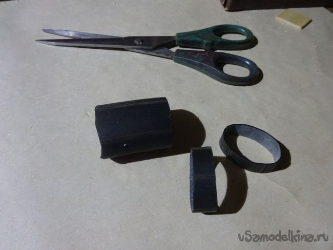 Шаг 5. С помощью канцелярских ножниц разрезаем велосипедную камеру на два кольца шириной, равной, примерно, одному сантиметру.