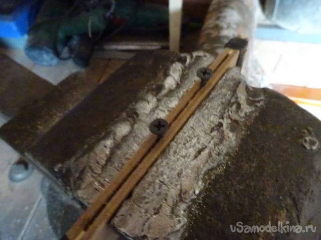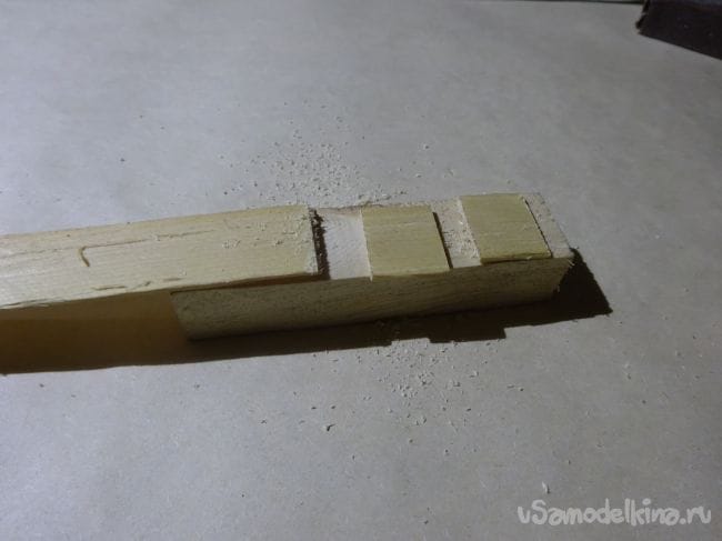Шаг 4. Берем подготовленную рейку и пилим ее на две части размером приблизительно 2,5 х 2 см.