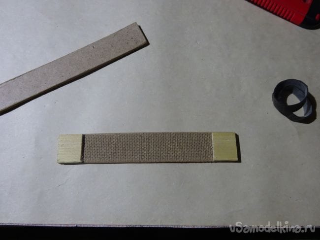 Шаг 6. Кладем на шероховатую поверхность (чтоб обрабатываемое изделие попадало в отчасти готовое расположение) по краям первой заготовки две деревянные прокладки. Сверху на них - вторую заготовку гладкой стороной наружу, так, чтобы будущие крепежные изделия касались двух шероховатых сторон. Берем два резиновых кольца и обматываем «восьмеркой» концы двух оргалитовых пластин. Наше приспособление готово.