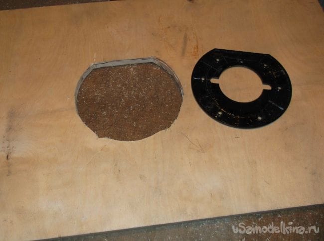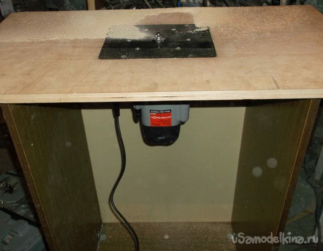 С ручного фрезера снял подошву при помощи которой разметил и выпилил при помощи электролобзика сквозной контур в столешнице. Отверстие в столешнице сделал немного больше подошвы, что бы плита фрезера свободно заходила.