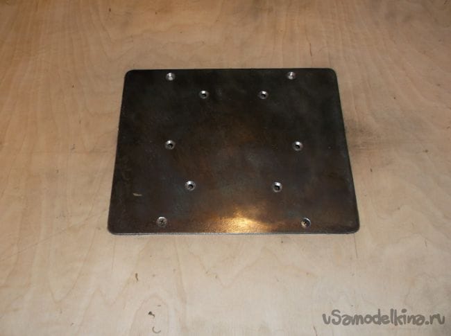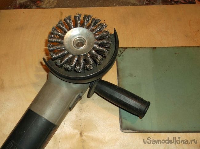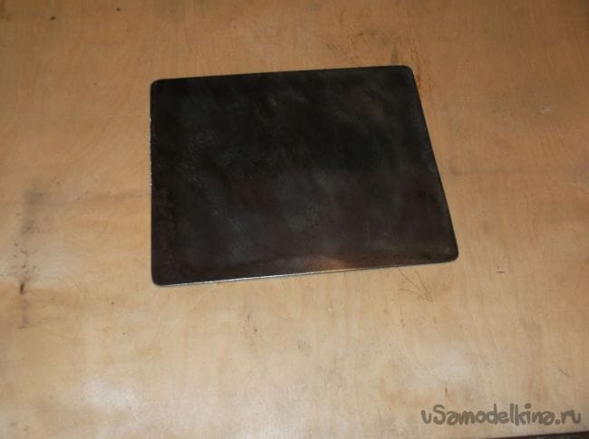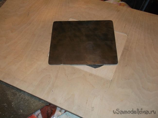 В качестве будущей стальной плиты выпилил из листовой стали толщиной 2 мм прямоугольник, который примерно на 3 см с каждой стороны больше выпиленного контура в столе. Так как железо использовалось не новое, избавиться от старой краски помогла обдирочная насадка на болгарку. Железо в 2 мм. это то, что было в наличии но на мой взгляд лучше использовать 3 мм. лист с ровной плоскостью, вмятины и изгибы недопустимы.