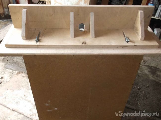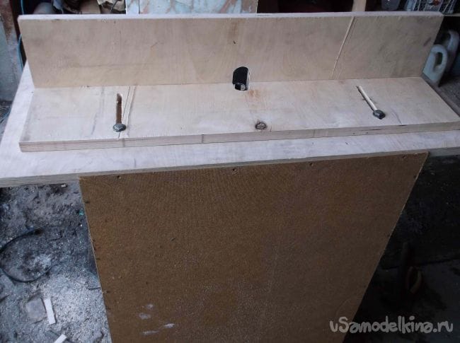 После для удобства вместо гаек в стол запрессовал шляпки болтов, а вместо гаек сверху через шайбы установил «барашки». Соединил полоски упора под углом 90 градусов и усилил ребрами жесткости из той же фанеры.