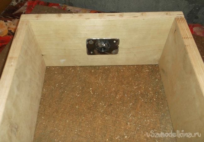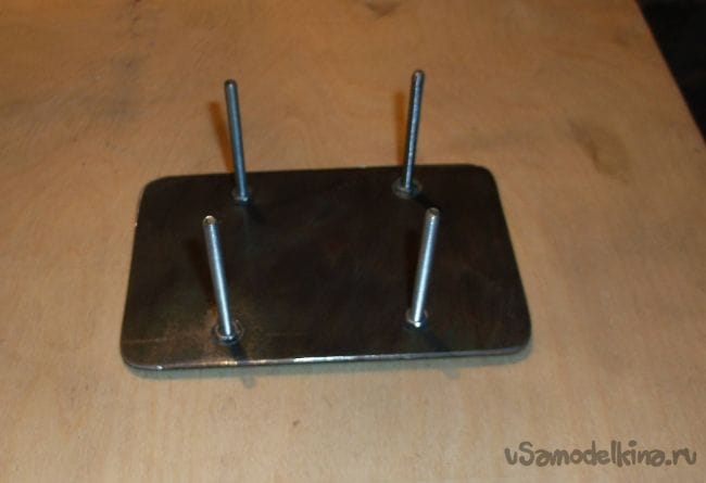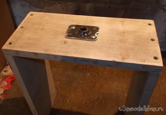 Упор для лифта сделал из той же фанеры с размерами: высота – 38 см, ширина – 30 см, глубина 14 см. В качестве неподвижной части резьбового лифта использовал гайки, приваренные к небольшим площадкам из листового железа 2 мм. и закрепленные с двух сторон нижней части упора при помощи саморезов.